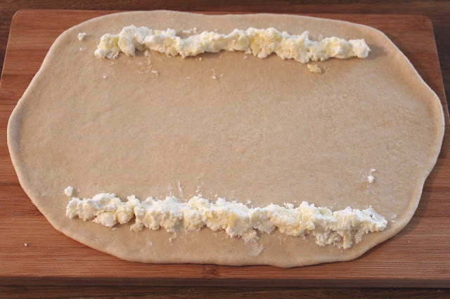 След като тестото е втасало, се взима една питка и се разточва на тънък правоъгълник или овал (или нещо приблизително подобно). В краищата се поставя малко от сиренето - по начина, посочен на снимката.